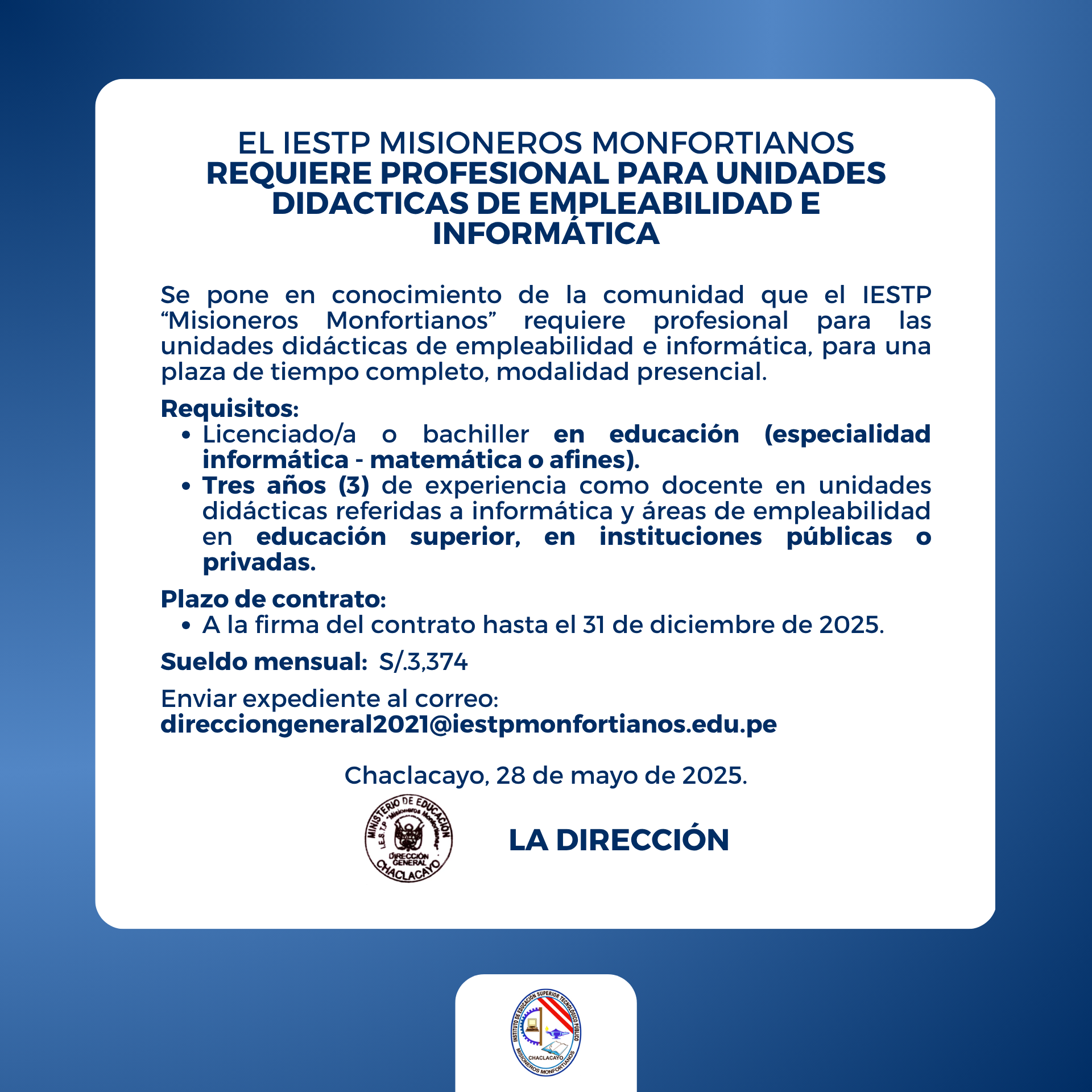 Se requiere Profesional en Unidades Didácticas de Informática y Empleabilidad